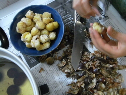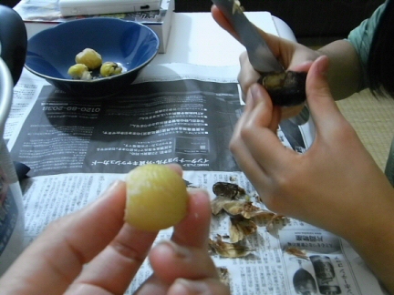 栗を取り出しつつ、ナイフや小型の包丁で皮をむく。
