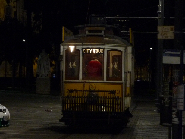 夜遅くの市電(街中のツアー用?)にサンタの衣装を着たヒトが!