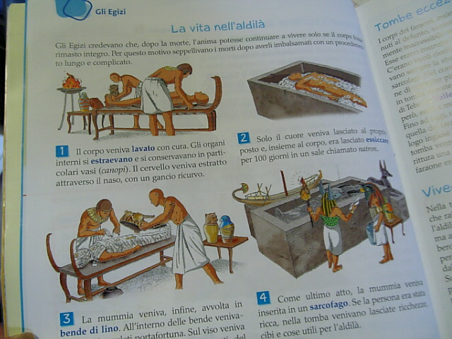 お嬢さんぐらいの歳に本で読みましたよ。体の脇に2本の線を引いてそこから切っていく・・とか脳みそは薬を入れて柔らかくして鼻から鍵状の物で引っ張り出すとかこの教科書より詳しく書いてあったことを今でも断片的に覚えています。