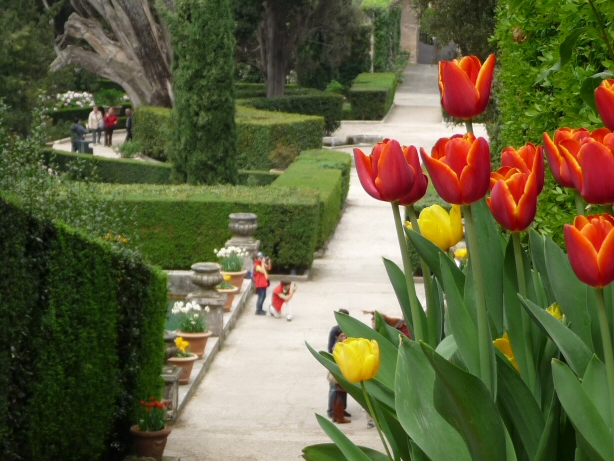 迷路のような緑の美しい庭と大きな噴水が見える。