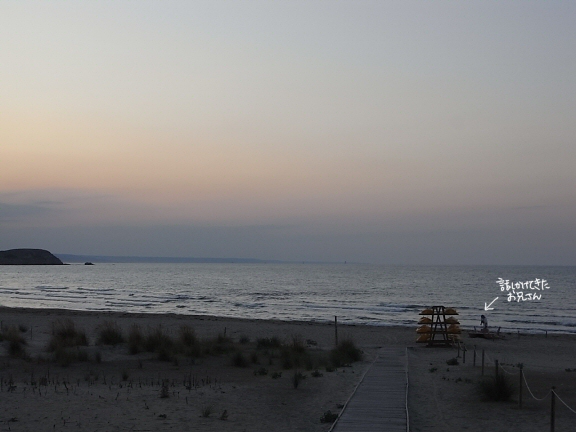 波打ち際でムスメと遊んでいたら、金髪ロンゲの白人男性が話しかけてきた。