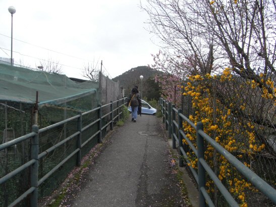 ホテルから”広い車道もあるけど、歩道を通ったら駅まで5分よ”