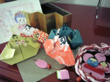 帰宅後、せっせと折り紙。雛飾り製作。顔は各自担当。