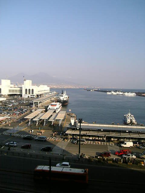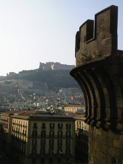 城の中央辺りの踊り場から、ナポリ港を望む。