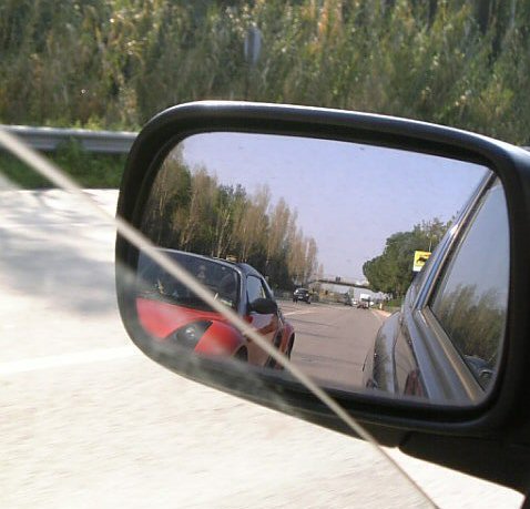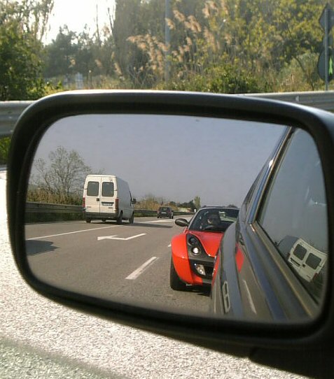 ミラー越しに、ぐんぐん追いついてくるスマートを