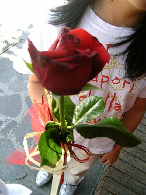 土曜日に小学校で子から母へ手渡されたらしい一輪のバラ。