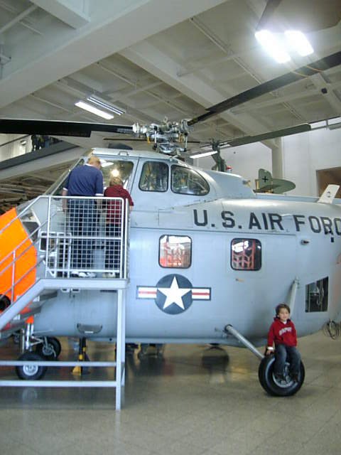 ヘリコプターもたくさんあって、その足元にちょこんと座ってる