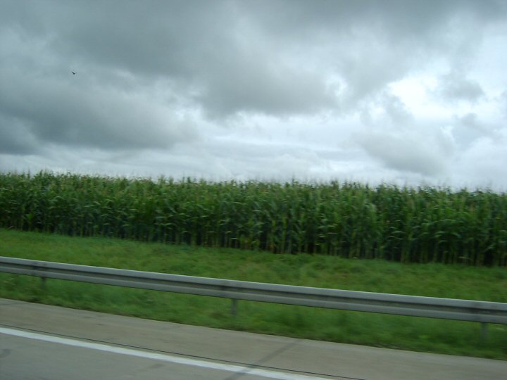 高速道路を降りると、緑の平原とトウモロコシ畑が広がる。