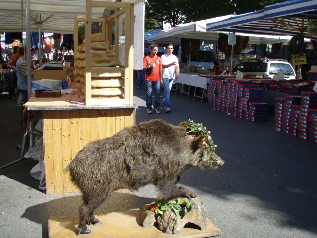 看板代わりに?豚(猪?)の剥製があちこちに立ってる。