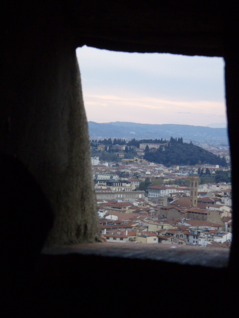 階段の脇にある小さな窓から臨むフィレンツェの街並み。