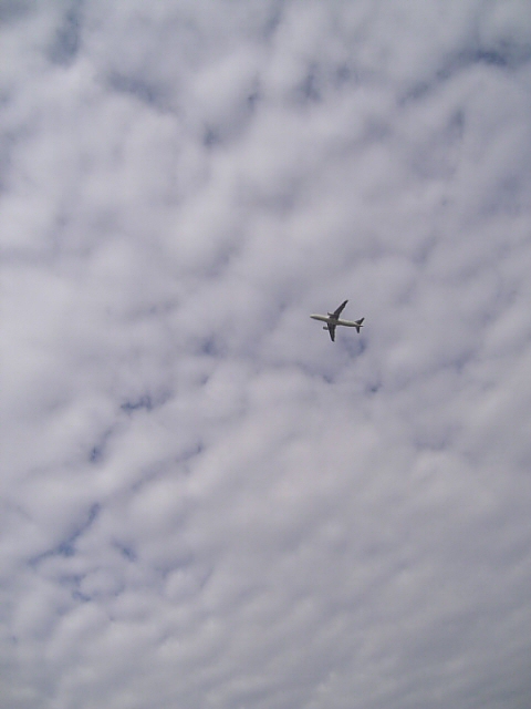 ひつじ雲を悠々と泳ぐ銀色の鵬。(これのみ携帯で撮影)