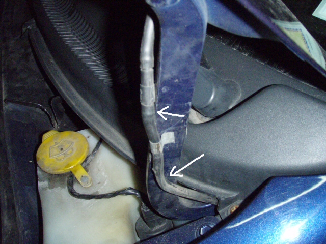 ボンネットに管(白い矢印部分)を挟んでて