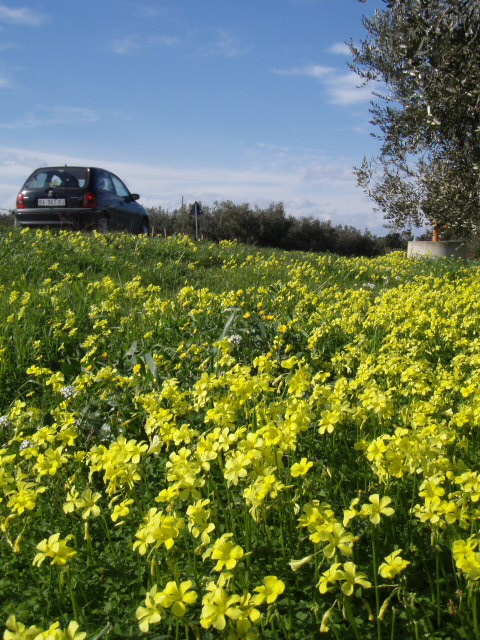 町外れにくると結構見かけるオリーブの木々とだだっ広い平地。
