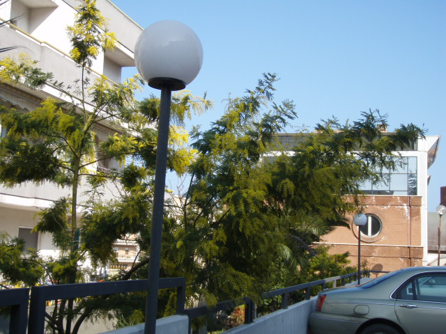 我が家のベランダから見下ろす隣の建物の庭にも、2本のミモザの