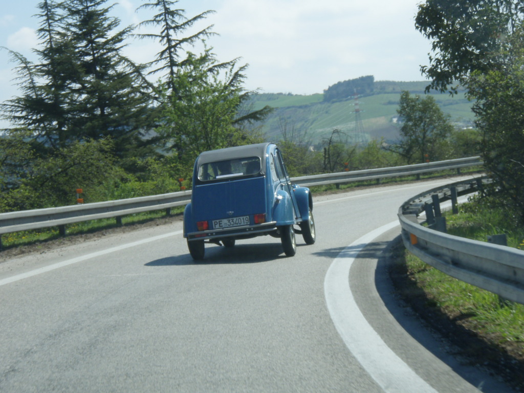 2CVのコーナリングを外から見るとクルマが倒れそうで怖いですが、中に乗っている人には恐怖感はありません(運転者じゃなくても)
