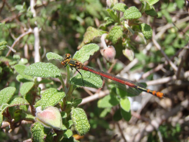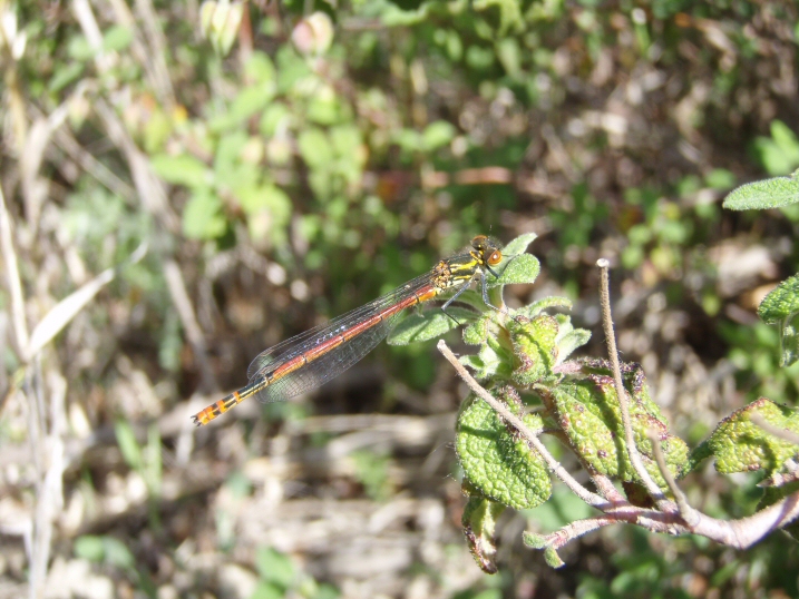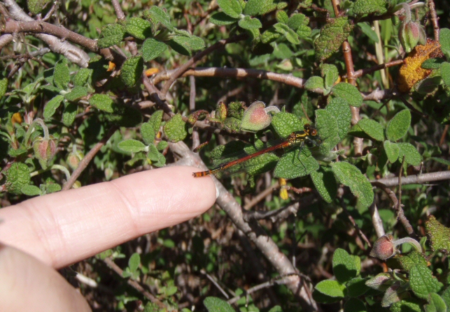 細くて赤い、美しいトンボが葉っぱに停まっていた。