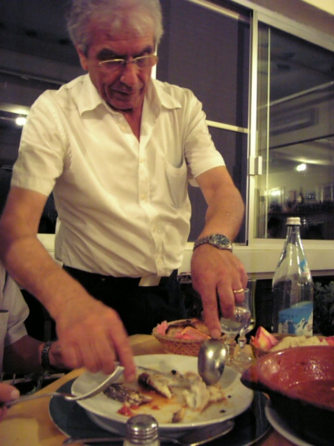 テーブルで魚を見事に捌いたり、自慢の甥っ子の写真を見せてくれたり。