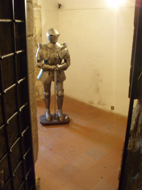 階段を降りてきたらまず目に入る、一瞬ドキリとする甲冑姿のオブジェ。