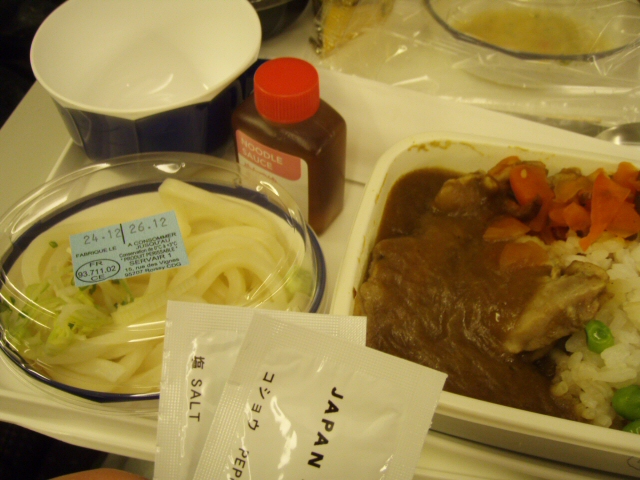 機内食はカレー。あたたかい日本茶が五臓六腑に染み渡る・・・じーん。
