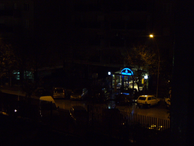 家の目の前のカフェには灯りが燈っていて