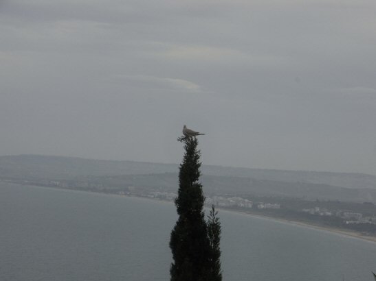 白っぽいハト?が飛んできて、ほっそい木の先に止まったが